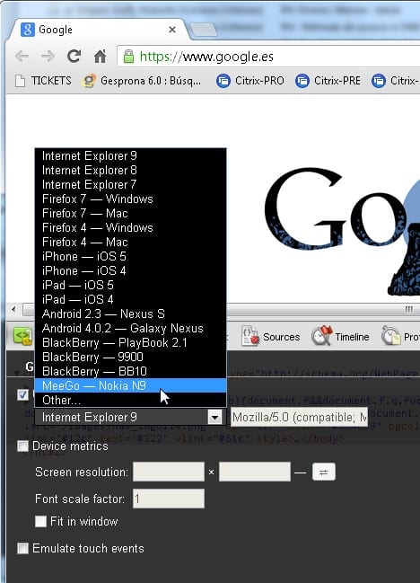 Para conseguir todas las funcionalidades podemos usar una aplicación que sea compatible o cambiar el User-Agent de la nuestra. En este caso, con chrome, nuestro Nokia N9 podrá adaptarse a dichas funcionalidades.