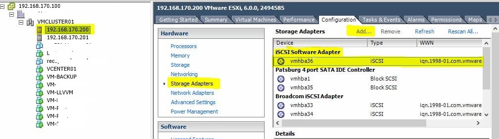 Ahora lo que haremos es encontrar a través del vclient el IQN a configurar. En cada host esxi, deberemos añadir un adaptador ISCSI, y ahí tendremos el WWN/IQN: