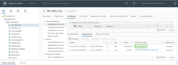 Así ya tenemos nuestro clúster vSAN en unos minutos. Se genera un volumen nuevo llamado vsanDatastore.