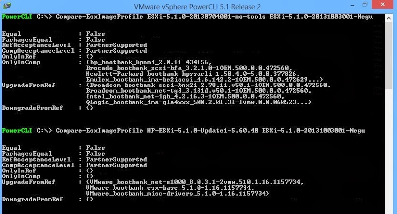 Compare-EsxImageProfile ESXi-5.1.0-20130704001-no-tools HP-ESXi-5.1.0-Update1-5.60.40 |