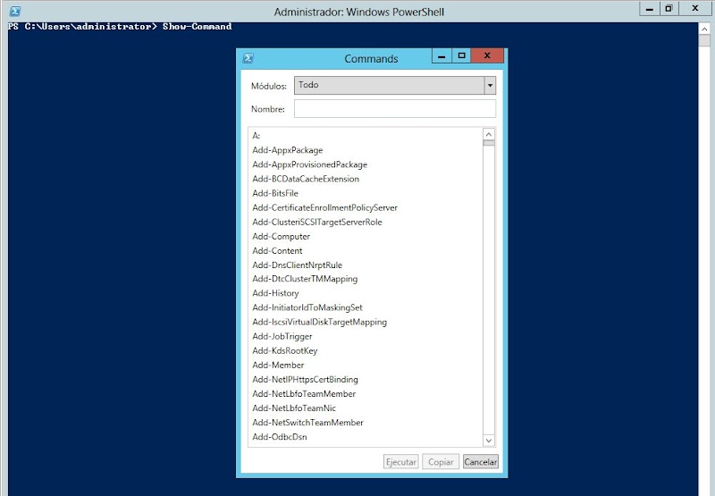 Show-Command es una ayuda gráfica que podemos utilizar como asistente para la ejecución de comandos. Si no ponemos ningún parámetro podremos seleccionar el comando del que queremos la ayuda. También está integrado con PowerShell ISE.