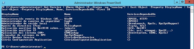 Ahora vemos que la salida en pantalla a variado ligeramente. Hemos redirigido la salida anterior al comando Select-Object que nos permite seleccionar que propiedades de cada objeto servicio queremos mostrar, en este caso, las propiedades Displayname, Name y ServicesDependedOn. Esta última propiedad no la estábamos viendo en los comandos anteriores ya que en la representación a texto por defecto de los servicios no está incluida, pero siempre ha estado disponible en el resultado final. Con la opción -Firs 10, lo que indicamos es que sólo queremos los 10 primeros objetos del resultado.