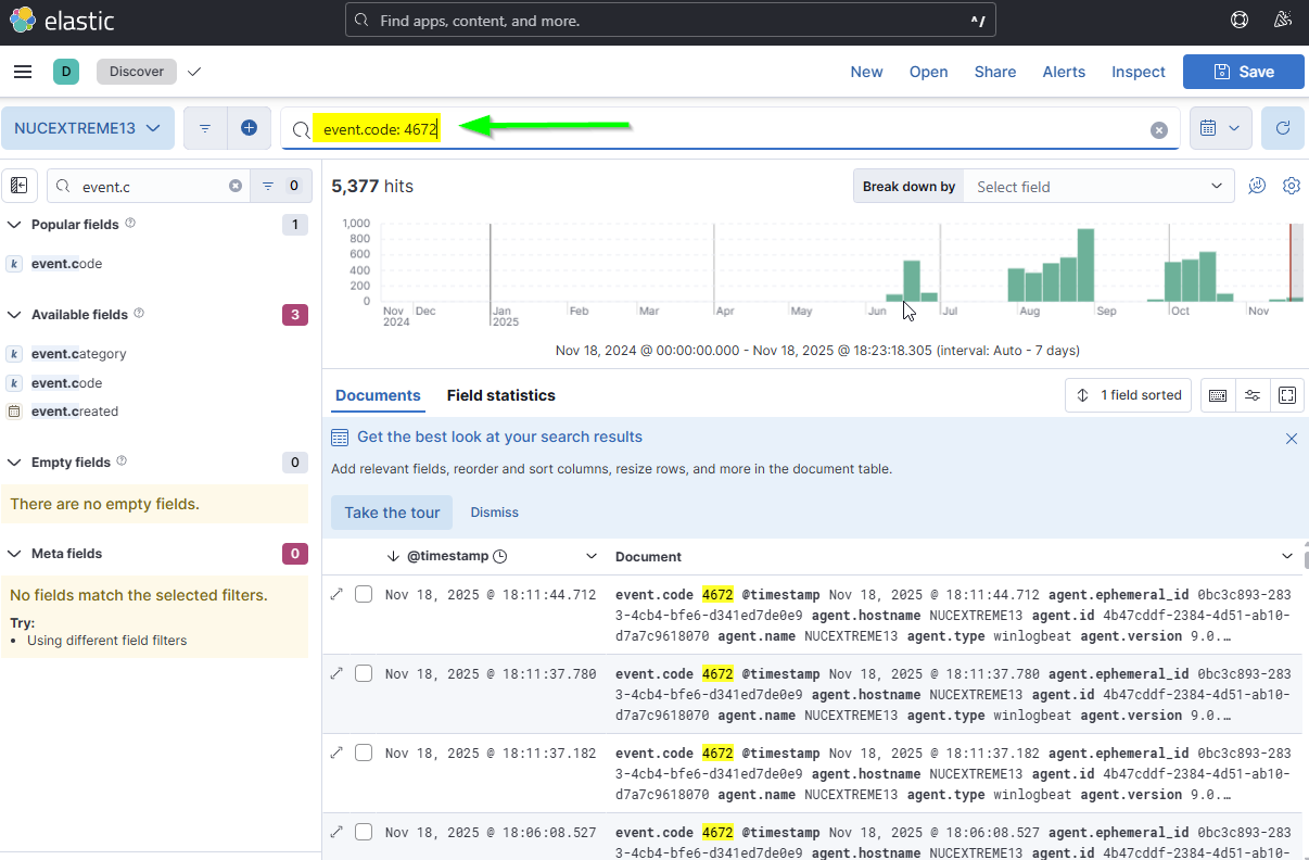 - event.code: 4625 (Login Fallido): Busca todos los intentos de inicio de sesión fallidos en Windows.