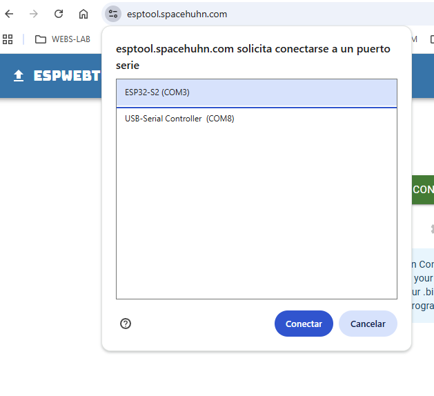Aparecerá un popup, elegimos ESP32-S2(COM3) y pulsamos CONECTAR: