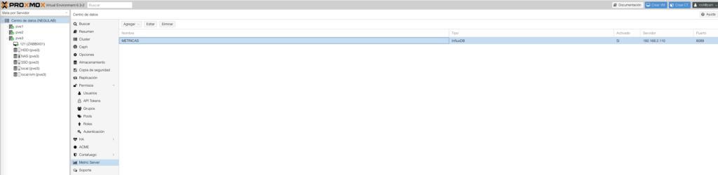 Para llegar al menú nos colocaremos en el Centro de datos -> Metric Server -> Agregar -> InfluxDB: