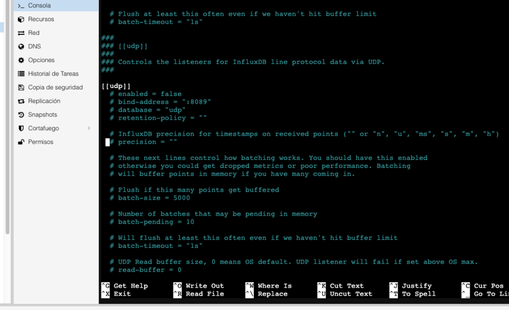 [[udp]] enabled = true bind-address = "0.0.0.0:8089" database = "proxmox" batch-size = 1000 batch-timeout = "1s" |