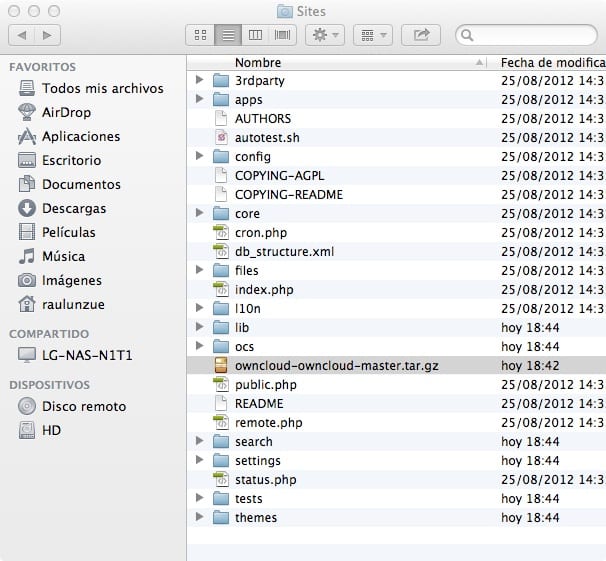 4. Movemos y extraemos los ficheros a /Applications/MAMP/htdocs: tar xfpj owncloud-1.2.tar.bz2