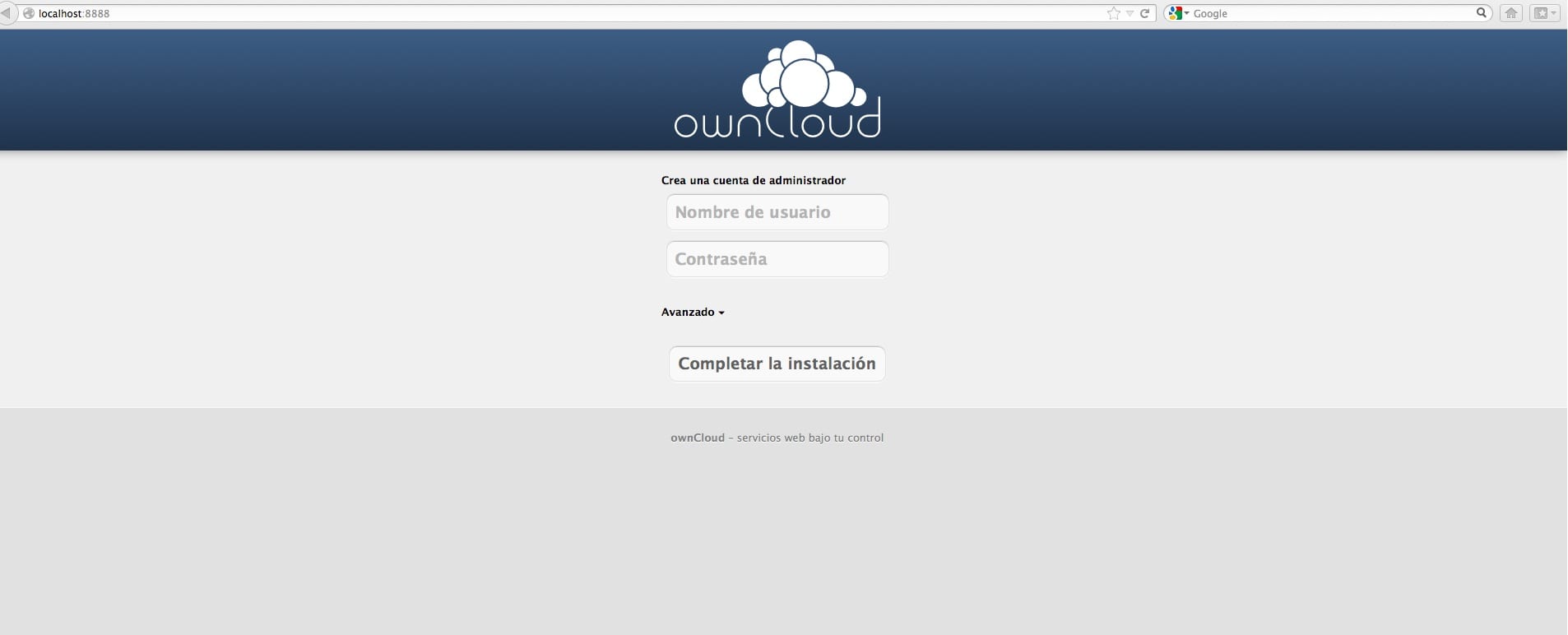 6. Abrimos el navegador http://localhost:8888/ y creamos usuario administrador y pulsamos Completar la instalación: