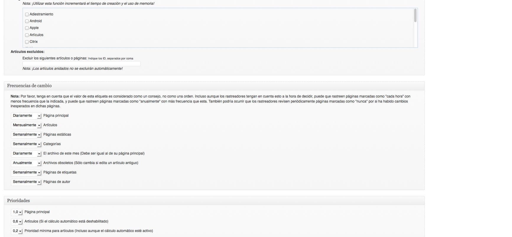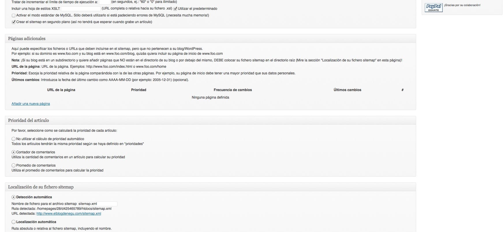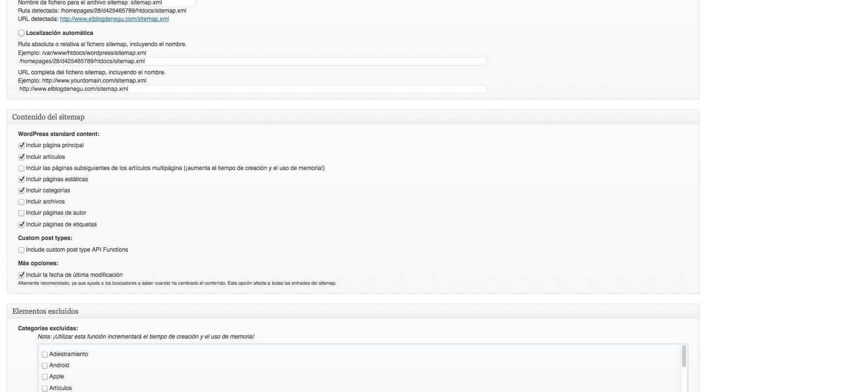 Nos parece más cómodo para configurar y con más opciones, lo instalas y para configurarlo Ajustes –> XML-Sitemaps