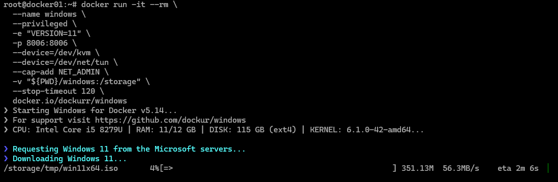 docker run -it --rm \ --name windows \ --privileged \ -e "VERSION=11" \ -p 8006:8006 \ --device=/dev/kvm \ --device=/dev/net/tun \ --cap-add NET_ADMIN \ -v "${PWD}/windows:/storage" \ --stop-timeout 120 \ docker.io/dockurr/windows |